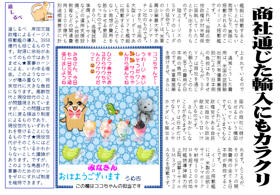 通常こうした費用は、米国の武器輸出制度(有償軍事援助)により、日本側の負担はありません。ところが、SPY7は商社を通じた輸入です。このため、全ての費用が日本側の負担になるのです。米軍需産業を儲けさせ、さらに国内の商社に儲けさせるという構図になっていることです。いうまでもなく、これによって、政権党である自民党に商社から政治献金という甘い汁が入るのです。