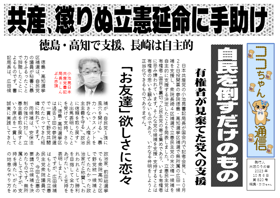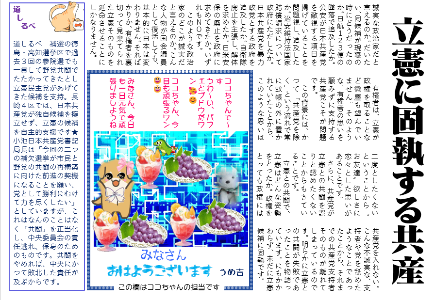 道しるべ 補選の徳島・高知選挙区で過去3回の参院選でも一貫して野党共闘でたたかってきたとし立憲民主党があげてきた候補を支持。長崎4区では、日本共産党が独自候補を擁立せず、立憲の候補を自主的支援です★小池日本共産党書記局長は「今回の二つの補欠選挙が市民と野党の共闘の再構築に向けた前進の契機になることを願い、党として勝利にむけて力を尽くしたい」としていますが、これはなんのことはなく「共闘」を正当化し、中央委員会の責任逃れ、保身のためのものです。共闘をやめれば、中央にかつて敗北した責任が及ぶからです。