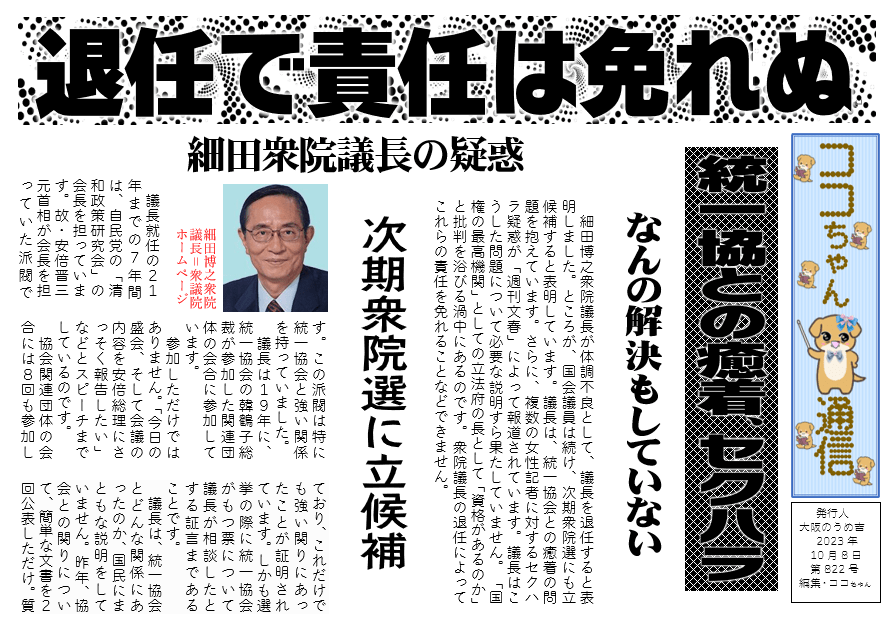 道しるべ 細田博之衆院議長が議長を退任するとの報道。体調不良を理由としています、にもかかわらず、次期衆院選には立候補するとしています★議長として抱えている疑惑隠しです。議長をやめたからと言って疑惑がなくなるわけでありません。議長はこのことをどう言い繕うつもりなのでしょうか★統一協会の問題が、首相殺害という問題を引き起こしただけに重大問題。衆院議長たるものが女性記者にセクハラ。これも見過ごすことなど出来ない問題です。セクハラという認識がないとすれば、議長どころか国会議員としての資質が問題です。