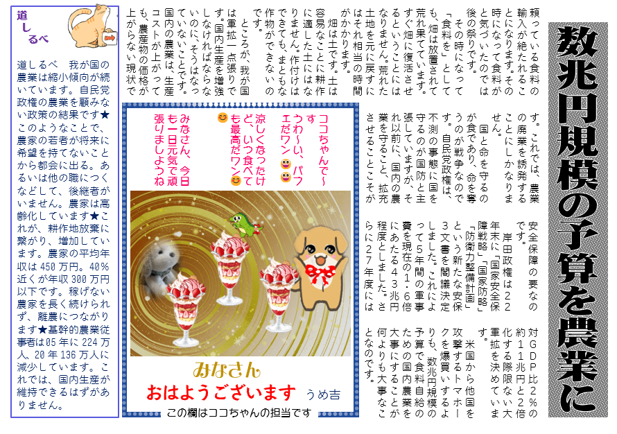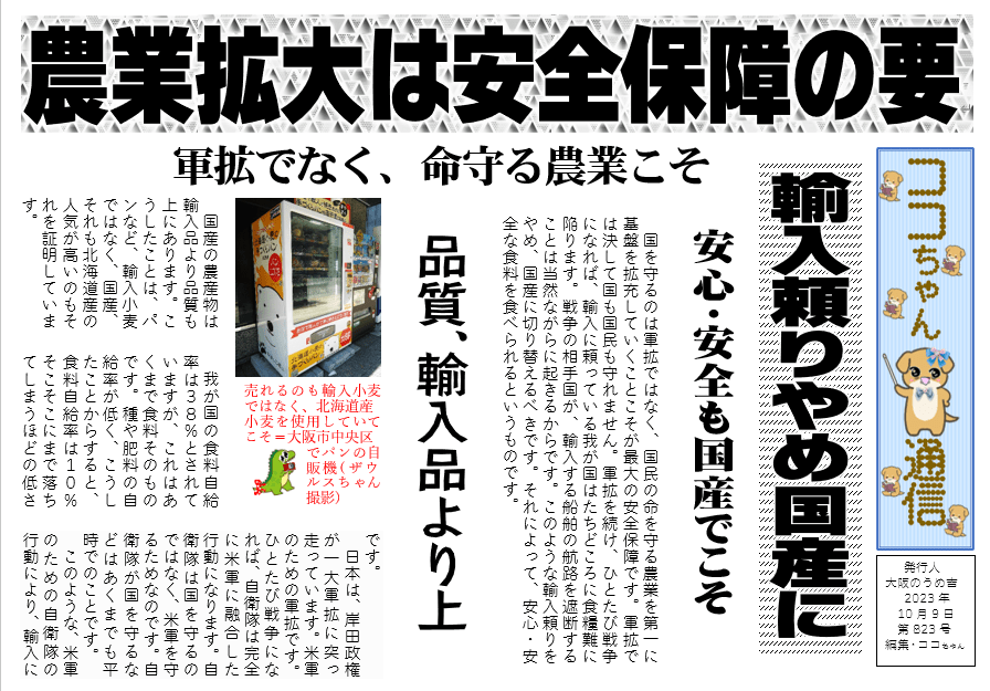 国を守るのは軍拡ではなく、国民の命を守る農業を第一に基盤を拡充していくことこそが最大の安全保障です。軍拡では決して国も国民も守れません。軍拡を続け、ひとたび戦争になれば、輸入に頼っている我が国はたちどころに食糧難に陥ります。戦争の相手国が、輸入する船舶の航路を遮断することは当然ながらに起きるからです。このような輸入頼りをやめ、国産に切り替えるべきです。それによって、安心・安全な食料を食べられるというものです。