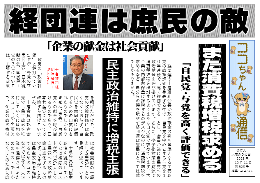 経団連の十倉雅和会長が政治献金の判断基準となる主要政党の政策評価を発表する中で、自民党を中心とする与党を10年連続で「高く評価できる」とし、会員企業に自民党への政治献金を呼び掛けています。さらに、少子化対策の財源で消費税増税を検討するようまたも自民党に求めています。大企業の内部留保金に課税するのがスジなのに、消費税増税を求めるなど、自分らの懐を肥やす経団連は庶民にとっては敵でしかありません。