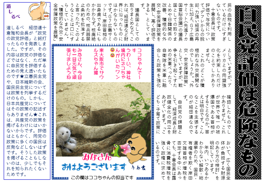 道しるべ 経団連十倉雅和会長が「政党の政党評価」と銘打ったものを発表しました。ですが、その内容は政党の評価などではなく、ただ単に自民党を評価するための見え透いたものです★立憲民主党や、日本維新の会、国民民主党については政策を列挙するだけのもの。しかも、日本共産党についてはその政策の記述すらありません★これは、共産党の政策を掲げるわけにはいかないからです。評価はともかく、同党の政策に多くの国民は反発などしないはずです。そうした政策を掲げることもしないのは、少しでもそれを知られたくないためです。