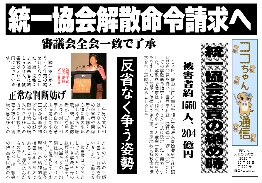 統一協会がとうとう年貢の納め時になりました。統一協会による被害者は約1500人、被害額は204億円に上っています。