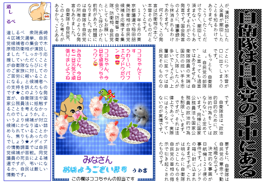 17年6月の東京都議選で稲田朋美防衛相が自民党候補を応援する集会で「防衛省・自衛隊、防衛相、自民党としてもお願いしたい」と呼びかけた前例があり、問題になりました。古くには自衛隊を自民党の所有のような発言もありました。