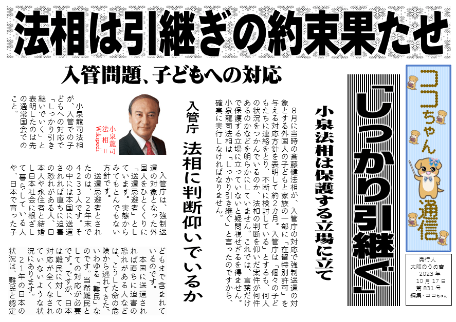 8月に当時の斎藤健法相が、入管庁の対応で強制送還の対象とする外国人の子どもと家族の一部に「在留特別許可」を与える対応方針を表明して約2カ月。入管庁は「個々の子どもたちに連絡をとり、不断に検討している」とするも、何人の状況をつかんでいるのか、法相の判断を仰いだ案件が何件あるのかなどを明らかにしていません。これでは、言葉だけで保護する立場に立っていないと疑問視せざるを得ません。小泉龍司法相は「しっかり引き継ぐ」と言ったのですから、確実に実行しなければなりません。