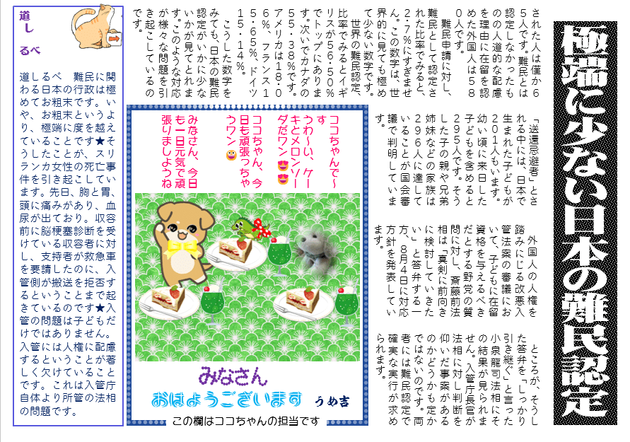道しるべ 難民に関わる日本の行政は極めてお粗末です。いや、お粗末というより、極端に度を越えていることです★そうしたことが、スリランカ女性の死亡事件を引き起こしています。先日、胸と胃、頭に痛みがあり、血尿が出ており。収容前に脳梗塞診断を受けている収容者に対し、支持者が救急車を要請したのに、入管側が搬送を拒否するということまで起きているのです★入管の問題は子どもだけではありません。入管には人権に配慮するということが著しく欠けていることです。これは入管庁自体より所管の法相の問題です。