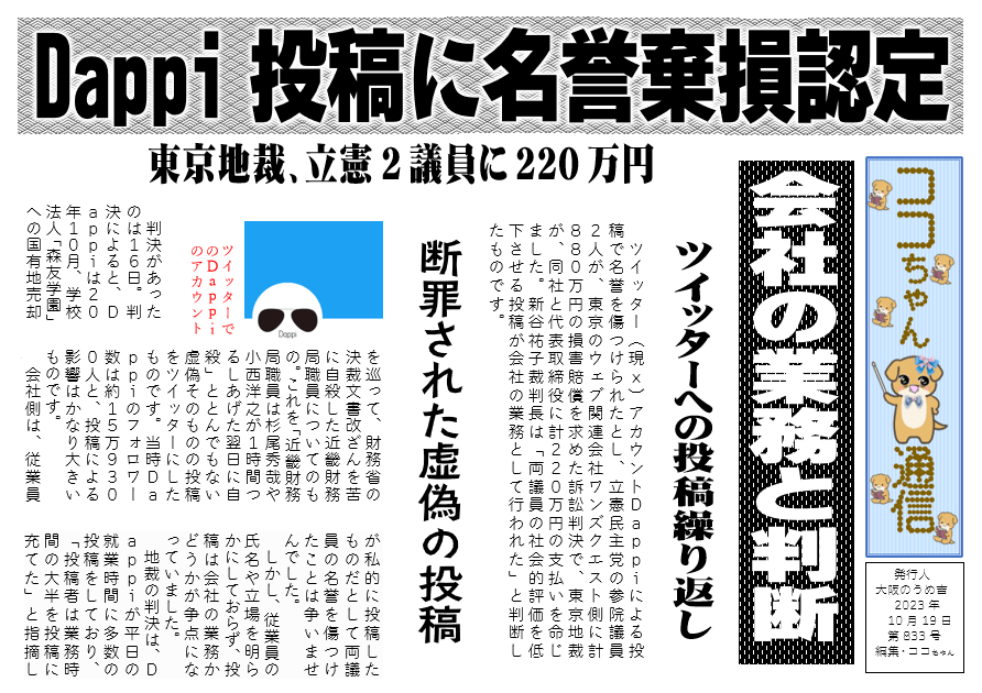 ツイッター(現x)アカウントDappiによる投稿で名誉を傷つけられたとし、立憲民主党の参院議員2人が、東京のウェブ関連会社ワンズクエスト側に計880万円の損害賠償を求めた訴訟判決で、東京地裁が、同社と代表取締役に計220万円の支払いを命じました。新谷祐子裁判長は「両議員の社会的評価を低下させる投稿が会社の業務として行われた」と判断したものです。