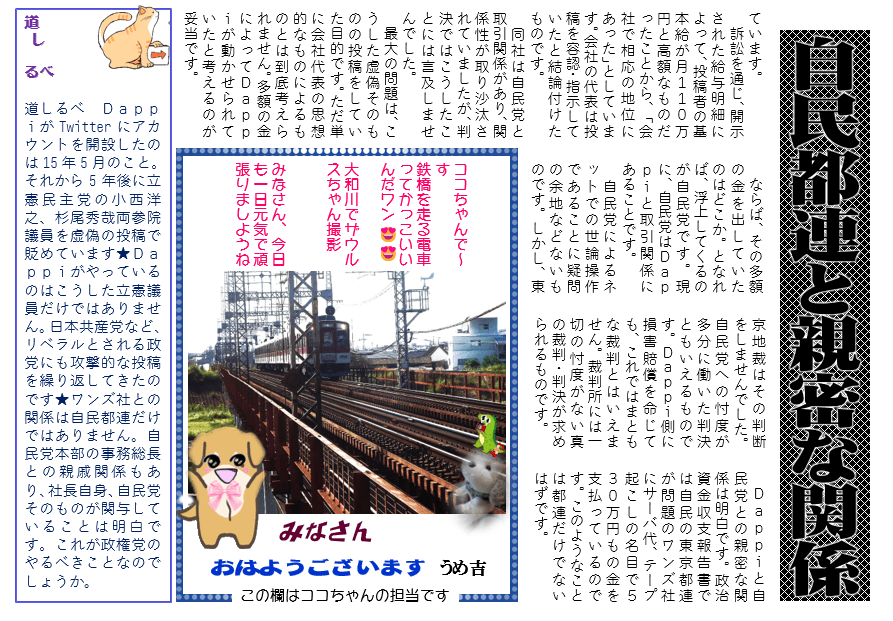 道しるべ DappiがTwitterにアカウントを開設したのは15年5月のこと。それから5年後に立憲民主党の小西洋之、杉尾秀哉両参院議員を虚偽の投稿で貶めています★Dappiがやっているのはこうした立憲議員だけではありません。日本共産党など、リベラルとされる政党にも攻撃的な投稿を繰り返してきたのです★ワンズ社との関係は自民都連だけではありません。自民党本部の事務総長との親戚関係もあり、社長自身、自民党そのものが関与していることは明白です。これが政権党のやるべきことなのでしょうか。