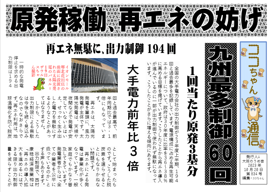一時的な発電停止を求める出力制限は194回と過去最高で、前年同期比では3・1倍にもなっています。