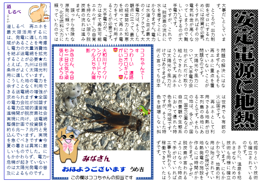 道しるべ 再エネを最大限活用するには、発電に適した地域があることを考慮し電力の大量消費地を結ぶ送電網を拡充することが必要★たとえば、九州は日照条件がよく太陽光利用に適しています。こうした地の電力を余すことなく利用できる送電網の増強が求められます★全国の電力会社が加盟する電力広域的運営推進機関が脱炭素社会実現に向け、送電網整備計画で投資額を約6兆~7兆円と見込んでいます。実現を急ぐべきです★今夏の暑さは異常に厳しいものでした。にもかかわらず、電力危機が起きていないのは太陽光発電の普及によるものです。