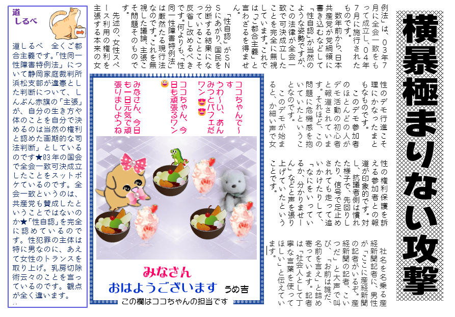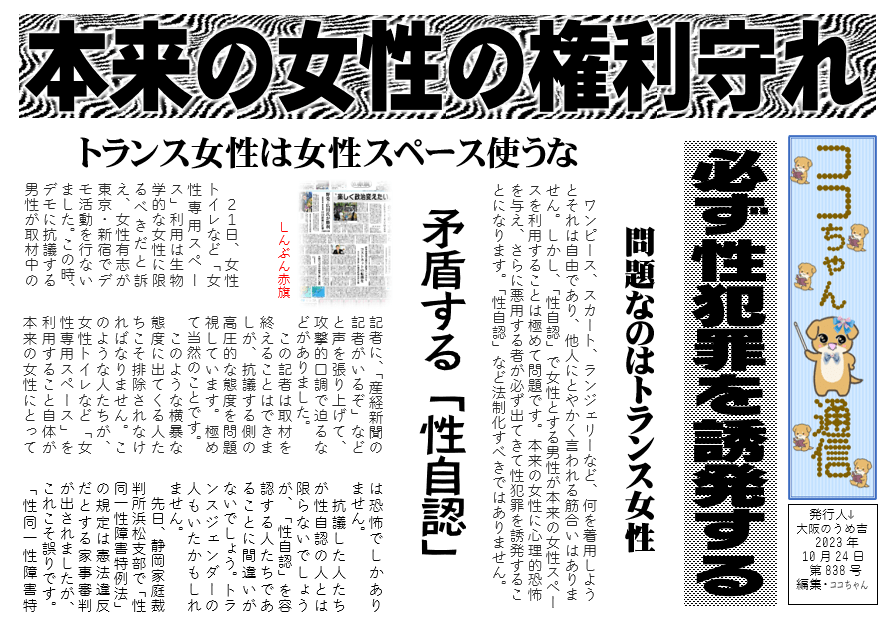 道しるべ 全くご都合主義です。「性同一性障害特例法」について静岡家庭裁判所浜松支部が違憲とした判断について、しんぶん赤旗の「主張」が、自分の生き方や体のことを自分で決めるのは当然の権利と認めた画期的な司法判断」としているのです★03年の国会で全会一致可決成立したことをスットボケているのです。全会一致というのは、共産党も賛成したということではないのか★「性自認」を完全に認めているのです。性犯罪の主体は特に男なのに、あえて女性のトランスを取り上げ。乳房切除術云々のことを言っているのです。観点が全く違います。