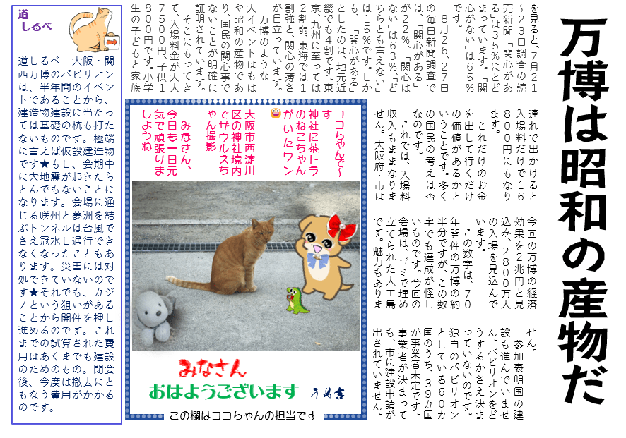 道しるべ 大阪・関西万博のパビリオンは、半年間のイベントであることから、建造物建設に当たっては基礎の杭も打たないものです。極端に言えば仮設建造物です★もし、会期中に大地震が起きたらとんでもないことになります。会場に通じる咲州と夢洲を結ぶトンネルは台風でさえ冠水し通行できなくなったこともあります。災害には対処できていないのです★それでも、カジノという狙いがあることから開催を押し進めるのです。これまでの試算された費用はあくまでも建設のためのもの。閉会後、今度は撤去にともなう費用がかかるのです。