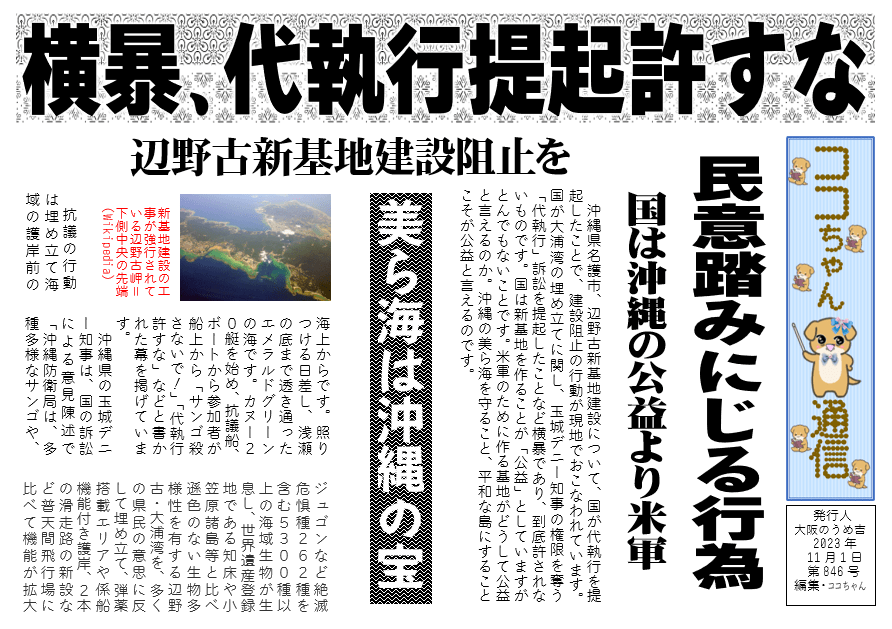 沖縄県名護市、辺野古新基地建設について、国が代執行を提起したことで、建設阻止の行動が現地でおこなわれています。国が大浦湾の埋め立てに関し、玉城デニー知事の権限を奪う「代執行」訴訟を提起したことなど横暴であり、到底許されないものです。国は新基地を作ることが「公益」としていますがとんでもないことです。米軍のために作る基地がどうして公益と言えるのか。沖縄の美ら海を守ること、平和な島にすることこそが公益と言えるのです。