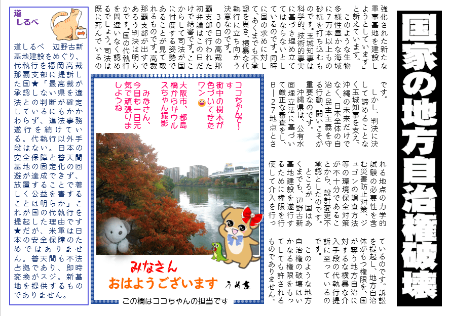 道しるべ 辺野古新基地建設をめぐり、代執行を福岡高裁那覇支部に提訴した国★「最高裁が承認しない県を違法との判断が確定しているにもかかわらず、違法事務遂行を続けている。代執行以外手段はない。日本の安全保障と普天間基地の固定化の回避が達成できず、放置することで著しく公益を害することは明らか」これが国の代執行を提起した理由です★だが、米軍は日本の安全保障のためではありません。普天間も不法占拠であり、即時変換がスジ。新基地を提供するものでありません。
