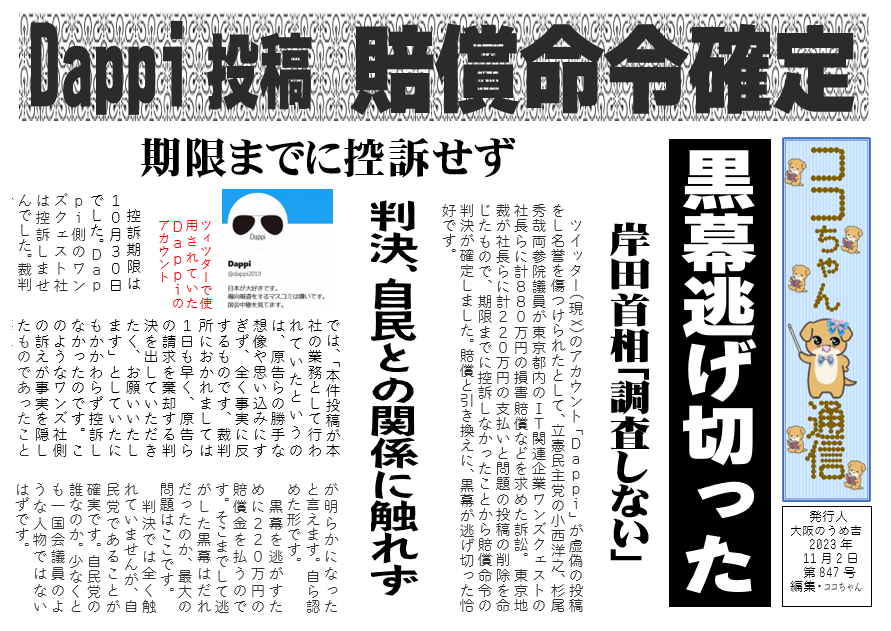 ツイッター(現X)のアカウント「Dappi」が虚偽の投稿をし名誉を傷つけられたとして、立憲民主党の小西洋之、杉尾秀哉両参院議員が東京都内のIT関連企業ワンズクェストの社長らに計880万円の損害賠償などを求めた訴訟。東京地裁が社長らに計220万円の支払いと問題の投稿の削除を命じたもので、期限までに控訴しなかったことから賠償命令の判決が確定しました。賠償と引き換えに、黒幕が逃げ切った恰好です。