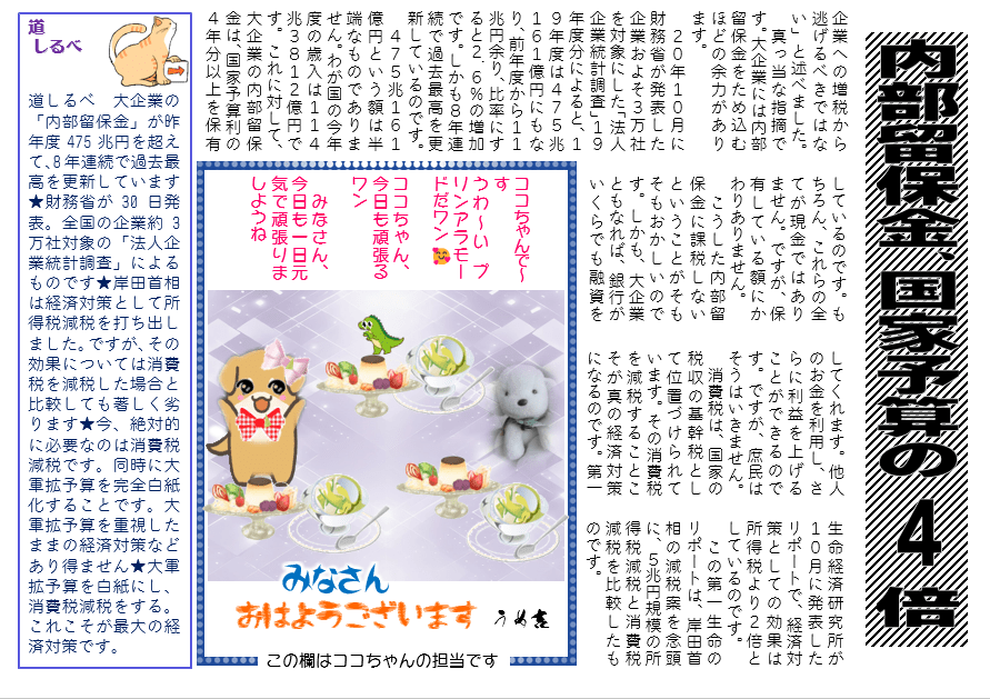 道しるべ 大企業の「内部留保金」が昨年度475兆円を超えて、8年連続で過去最高を更新しています★財務省が30日発表。全国の企業約3万社対象の「法人企業統計調査」によるものです★岸田首相は経済対策として所得税減税を打ち出しました。ですが、その効果については消費税を減税した場合と比較しても著しく劣ります★今、絶対的に必要なのは消費税減税です。同時に大軍拡予算を完全白紙化することです。大軍拡予算を重視したままの経済対策などあり得ません★大軍拡予算を白紙にし、消費税減税をする。これこそが最大の経済対策です。