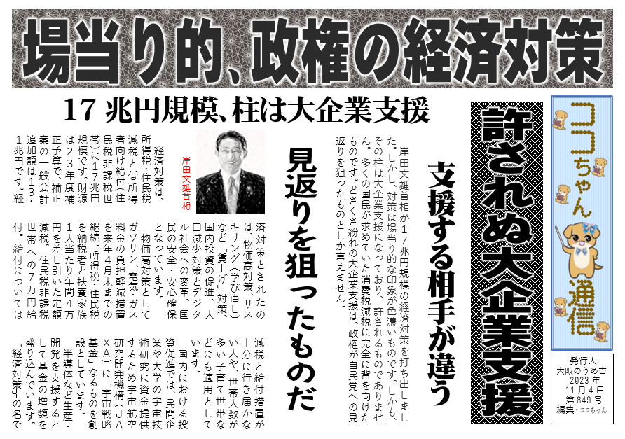 岸田文雄首相が17兆円規模の経済対策を打ち出しました。しかし、対策は場当り的な印象が色濃いものです。しかも、その柱は大企業支援になっており、許されるものでありません。多くの国民が求めていた消費税減税に完全に背を向けたものです。