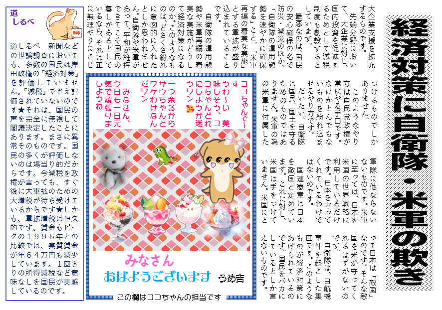 道しるべ 新聞などの世論調査においても、多数の国民は岸田政権の「経済対策」を評価していません。「減税」でさえ評価されていないのです★それは、国民の声を完全に無視して閣議決定したことにあります。まさに異常そのものです。国民の多くが評価しないのは場当り的だからです。今減税を政権が言っても、すぐ後に大軍拡のための大増税が待ち受けているからです★しかも、軍拡増税は恒久的です。賃金もピークの1996年との比較では、実質賃金が年64万円も減少しています。1回きりの所得減税など意味なしを国民が実感しているのです。