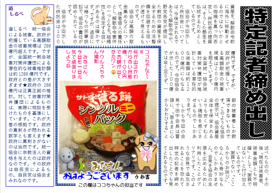 「心からのお詫び」として、統一協会日本法人の田中富広会長らが出席して会見を開きました。ですが、頭っから特定の記者を排除しています。心からのお詫びであるならこのような排除など出来ないはずです。協会が国に最大100億円を供託するという提案もしています。ですが、統一協会による被害は100億円などというものではありません。解散命令や、法整備に進むことを回避するための策でしかないことが明白です。しかも、このような被害が数多くあるのは、協会が組織的に関わってきたからであり、指導が行きわたらなかったからではありません。組織的関与なのは明らかです。