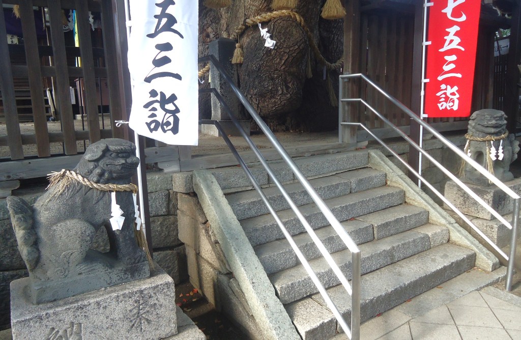 七五三の時期だけに、どこの神社でも七五三の赤いノボリが立てられています