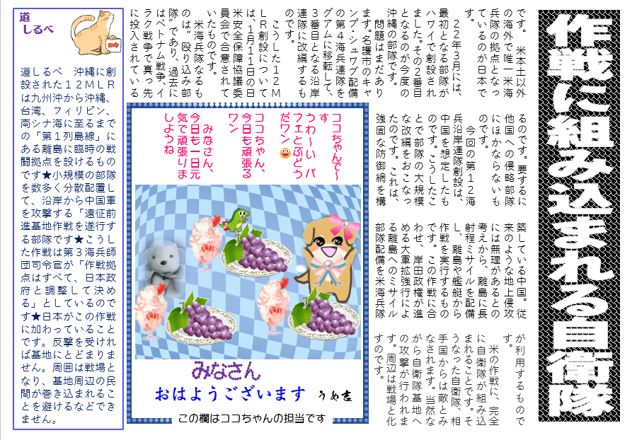 道しるべ 沖縄に創設された12MLRは九州沖から沖縄、台湾、フィリピン、南シナ海に至るまでの「第1列島線」にある離島に臨時の戦闘拠点を設けるものです★小規模の部隊を数多く分散配置して、沿岸から中国軍を攻撃する「遠征前進基地作戦を遂行する部隊です★こうした作戦は第3海兵師団司令官が「作戦拠点はすべて、日本政府と調整して決める」としているのです★日本がこの作戦に加わっていることです。反撃を受ければ基地にとどまりません。周囲は戦場となり、基地周辺の民間が巻き込まれることを避けるなどできません。