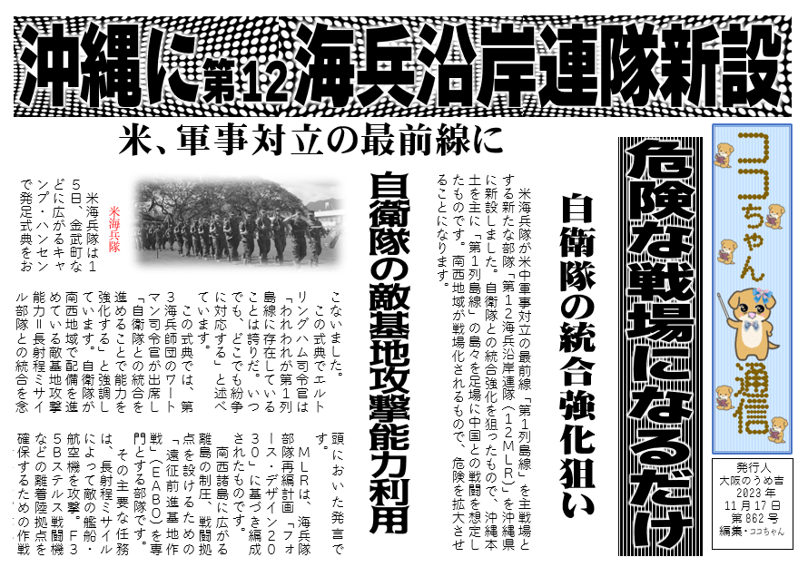 米海兵隊が米中軍事対立の最前線「第1列島線」を主戦場とする新たな部隊「第12海兵沿岸連隊(12MLR)」を沖縄県に新設しました。自衛隊との統合強化を狙ったもので、沖縄本土を主に「第1列島線」の島々を足場に中国との戦闘を想定したものです。南西地域が戦場化されるもので、危険を拡大させることになります