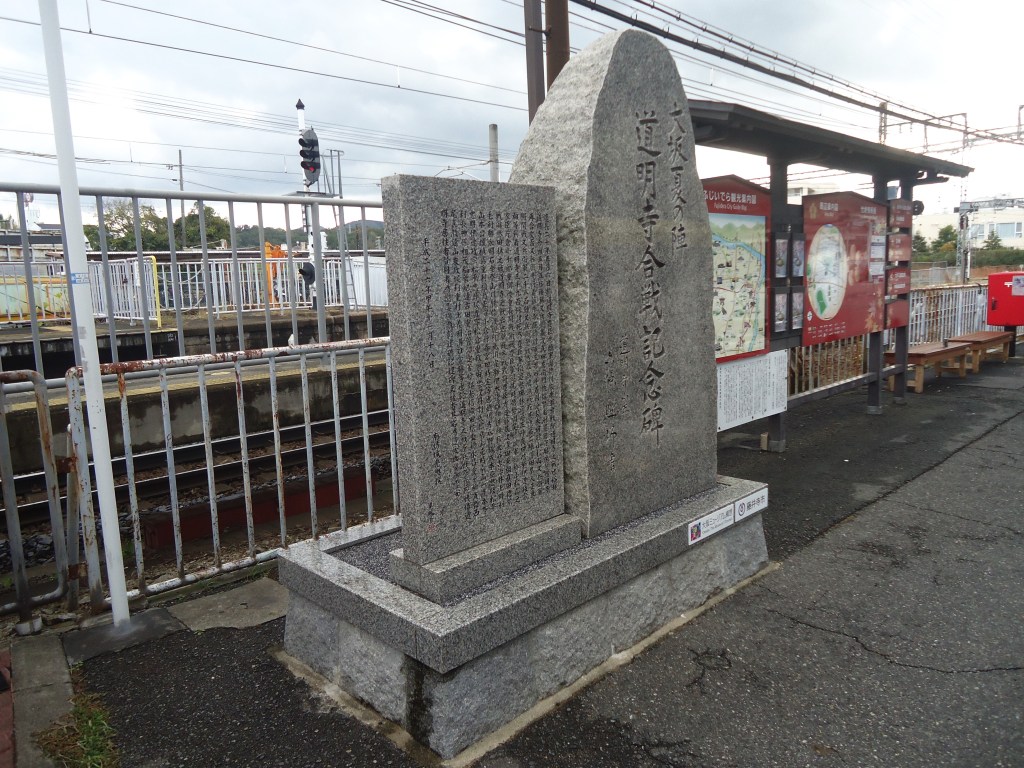 道明寺合戦 近鉄道明寺駅前に建てられた大坂夏の陣の碑(後方は駅ホーム)