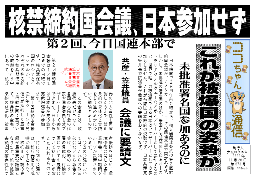 日本時間で28日午前0時から、核兵器禁止条約の第2回締約国会議が、アメリカ・ニューヨークの国連本部で開かれます。しかし、未批准の署名国のほか、米国と同盟関係にあるオーストラリアやノルウェーなどがオブザーバーとして参加するのに、世界で唯一の被爆国である日本はオブザーバーとしての参加もしません。これが被爆国日本政府の姿勢です。日本共産党の笠井亮衆院議員が会議への要請をおこないます。