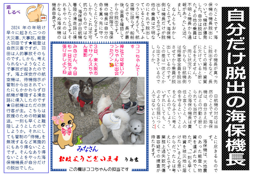 道しるべ 2024年の年明け早々に起きた二つの大災害、大事故。能登と羽田です★能登は自然災害ですが、羽田は人的事故そのものです。しかも、考えられないようなことで事故が起きたのです。海上保安庁の航空機は、待機指示が管制から出されていたにもかかわらず日航機が着陸する滑走路に侵入したのです★日航機はただの旅行客が主。こちらは救援のための物資輸送。一刻も早くと離陸しようとしたのでしようか。それにしても管制の「待機」を無視するなど常識的にもあり得ないことです。そんなあり得ないことをやった海保機機長が自分だけの脱出でした。