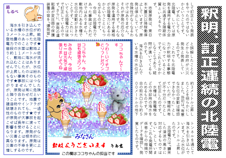 道しるべ 海水を引き込んでいる水槽の水位が約3メートル上昇。能登地震のあった北陸電力でのことです★普段の水面は敷地より約11メートル低く、敷地に海水が流れ込むことはありませんでしたが、水位が上昇したのは紛れもない事実そのものです★事故にはつながりませんでしたが、原発は常に危険と隣り合わせだということです。地震で建造物やインフラが破壊されても、一過性のものです★ですが原発が大事故を起こせば長年に渡って影響を受けることになります。原発がない災害とは根本的に異なります。原発は災害の不幸を更に上増しするのです。