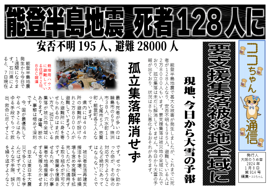 能登半島地震で甚大な被害が発生しましたが、これまでに死者が128人となり、安否不明も195人。避難している人は2万8000人もいます。要支援集落は被災地の全域に及んでおり、孤立集落は未だに解消していません。今日から大雪の予報が出ており、状況はさらに悪化するおそれがあります。
