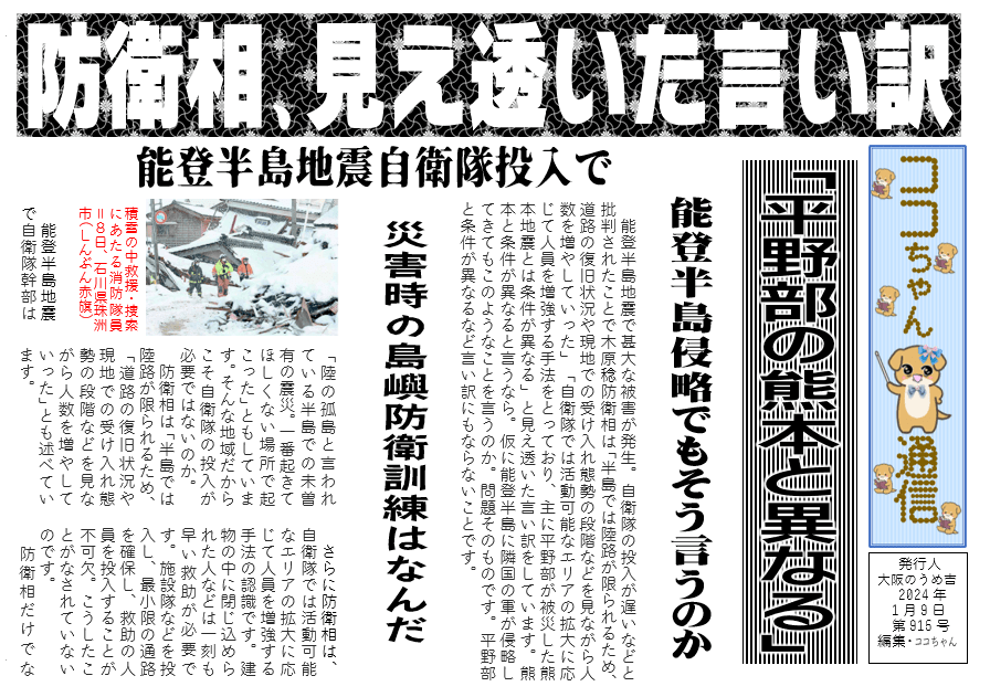 能登半島地震で甚大な被害が発生。自衛隊の投入が遅いなどと批判されたことで木原稔防衛相は「半島では陸路が限られるため、道路の復旧状況や現地での受け入れ態勢の段階などを見ながら人数を増やしていった」「自衛隊では活動可能なエリアの拡大に応じて人員を増強する手法をとっており、主に平野部が被災した熊本地震とは条件が異なる」と見え透いた言い訳をしています。熊本と条件が異なると言うなら。仮に能登半島に隣国の軍が侵略してきてもこのようなことを言うのか。問題そのものです。平野部と条件が異なるなど言い訳にもならないことです。