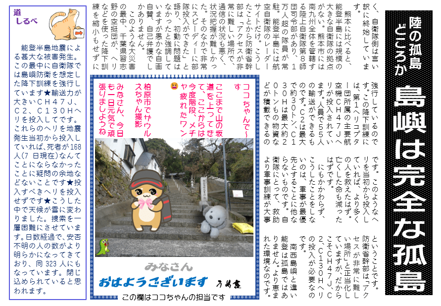 熊本に比べると、能登半島には規模の大きな自衛隊の拠点がない。熊本市には南九州全体を管轄する陸上自衛隊第8師団司令部があり、1万人超の隊員が常駐。能登半島には航空自衛隊のレーダーサイトだけ。こうしたことから防衛省幹部は「アクセスが非常に難しい場所で、通信の状況も悪く、状況把握が難しかった。そのなかで非常にスピーディーに部隊投入ができた」と語り、初動に問題はなかったと強調していますが愚かな自画自賛、自己弁護でしかありません。