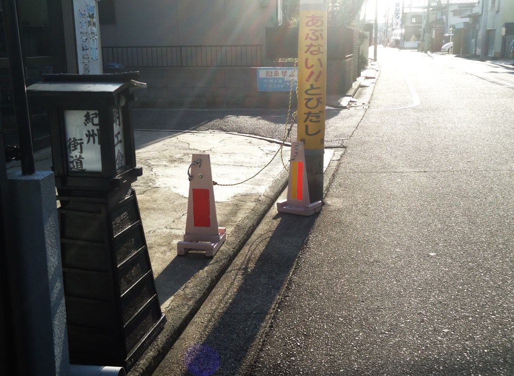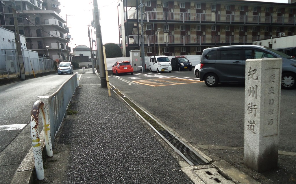 対向車線の2車線、左側のレンガ塀ぎりぎりに建てられている道標です😫