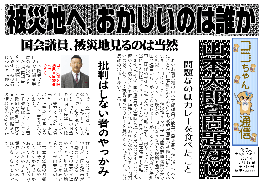 れいわ新選組の山本太郎議員が能登半島地震で被災地に入ったことを、日本維新の会の音喜多駿参院議員が執拗に非難しています。7日には、Xに「被災地からの再三再四の悲痛な呼びかけを無視し、レンタカーで渋滞の一因になりながら現地を回った。国会議員から上がってきたレポートが、ことごとく政府や県知事、関係者がすでに把握済みの情報ばかり。何やってんだよ、本当に」と投稿。YouTubeやブログでも山本議員を避難しています。ですが、国会議員が災害時に現地を見るのはイロハのイ。極めて当然のことで何ら避難されるいわれがないものです。問題なのは、被災地で被災者へのカレーを食べたことです。これには反論の余地もないことです。