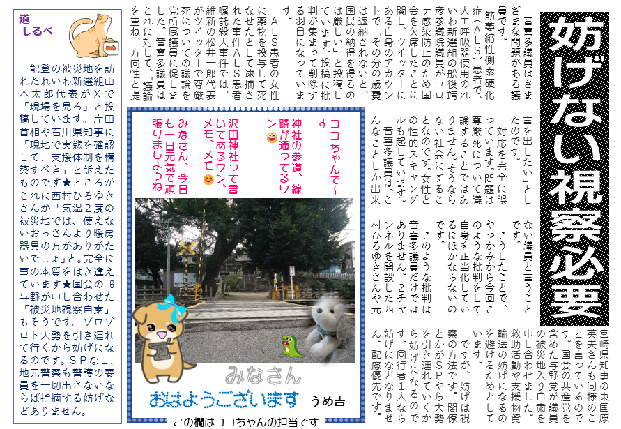 道しるべ 能登の被災地を訪れたれいわ新選組山本太郎代表がXで「現場を見ろ」と投稿しています。岸田首相や石川県知事に「現地で実態を確認して、支援体制を構築すべき」と訴えたものです★ところがこれに西村ひろゆきさんが「気温2度の被災地では、使えないおっさんより暖房器具の方がありがたいでしょ」と。完全に事の本質をはき違えています★国会の6与野が申し合わせた「被災地視察自粛」もそうです。ゾロゾロト大勢を引き連れて行くから妨げになるのです。SPなし、地元警察も警護の要員を一切出さないならば指摘する妨げなどありません。