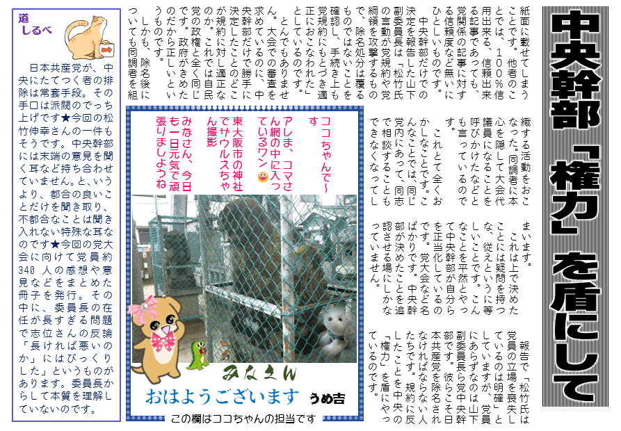 報告で「松竹氏は党員の立場を喪失しているのは明確」としていますが、党員にあらずなのは山下副委員長ら党中央幹部です。彼らこそ日本共産党を除名されなければならない人たちです。規約に反したことを中央の「権力」を盾にやっているのです。