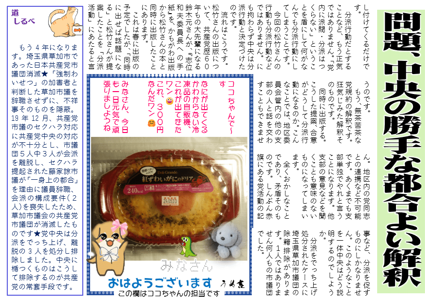 道しるべ もう4年になります。埼玉県草加市であった日本共産党市議団消滅★「強制わいせつ」の加害者と判断した草加市議を辞職させずに、不祥事そのものを隠蔽。19年12月、共産党市議のセクハラ対応に共産党中央の対応が不十分とし、市議団5人中3人が会派を離脱し、セクハラ提起された藤家諒市議が「一身上の都合」を理由に議員辞職、会派の構成要件(2人)を喪失したため、草加市議会の共産党市議団が消滅したものです★党中央は分派をでっち上げ、離脱の3人を処分し排除しました。中央に楯つくものはこうして排除するのが共産党の常套手段です。