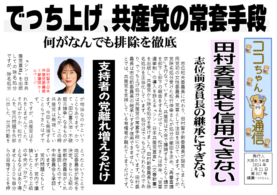 志位和夫委員長に代わり、田村智子新委員長が誕生しました。同党初の女性委員長・党首として注目を浴びています。ですが、党除名処分受けた松竹伸幸さんが処分の撤回を求め、「再審査請求」を行なっていました。共産党は大会で議論することなく請求を却下し却下の報告をするだけでした。松竹さんは昨年、「党首選挙制」の導入を訴える『シン・日本共産党宣言』(文春新書)を出版し、共産党から除名処分を受けました。田村新委員長も除名処分を正当化しています。処分はでっち上げられたものであり、でっち上げ処分は共産党の常套手段になっています。田村委員長は志位前委員長の継承にすぎず信用できません。こんなことでは、共産党を支持している有権者が離れてしまうだけです。