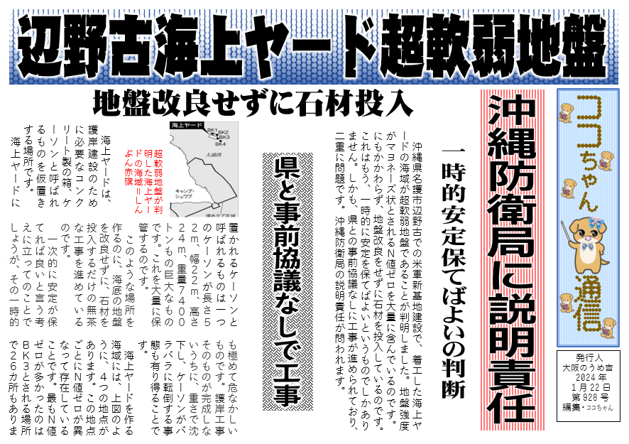 沖縄県名護市辺野古での米軍新基地建設で、着工した海上ヤードの海域が超軟弱地盤であることが判明しました。地盤強度がマヨネーズ状とされるN値ゼロを大量に含んでいるのです。にもかかわらず、地盤改良をせずに石材を投入しているのです。これはもう、一時的に安定を保てばよいというものでしかありません。しかも、県との事前協議なしに工事が進められており、二重に問題です。沖縄防衛局の説明責任が問われます。