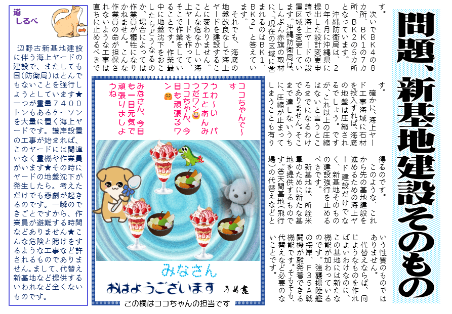 道しるべ 辺野古新基地建設に伴う海上ヤードの建設で、またしても国(防衛局)はとんでもないことを強行しようとしています★一つが重量7400トンもあるケーソンを大量に置く海上ヤードです。護岸設置の工事が始まれば、このヤードには間違いなく重機や作業員がいます★その時にヤードの地盤沈下が発生したら。考えただけでも悲劇が起きるのです。一瞬のできごとですから、作業員が避難する時間などありません★こんな危険と賭けをするような工事など許されるものでありません。まして、代替え新基地など提供するいわれなど全くないものです。
