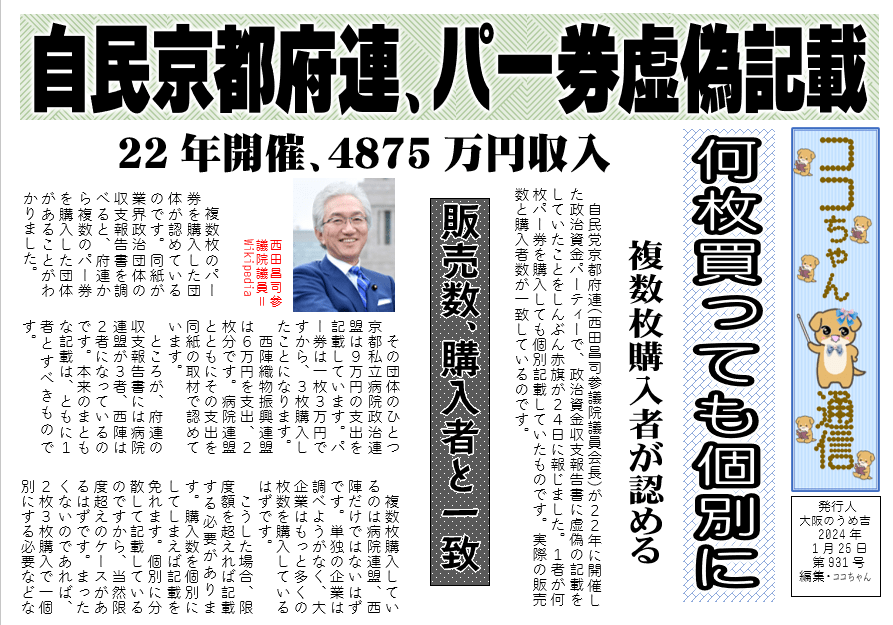 自民党京都府連(西田昌司参議院議員会長)が22年に開催した政治資金パーティーで、政治資金収支報告書に虚偽の記載をしていたことをしんぶん赤旗が24日に報じました。1者が何枚パー券を購入しても個別記載していたものです。実際の販売数と購入者数が一致しているのです。
