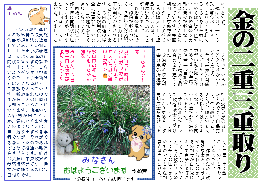 同紙は、自民党京都府連に質問状を送っていますが、期限までに回答をしていません。やましいことをやっているから答えられないということです。