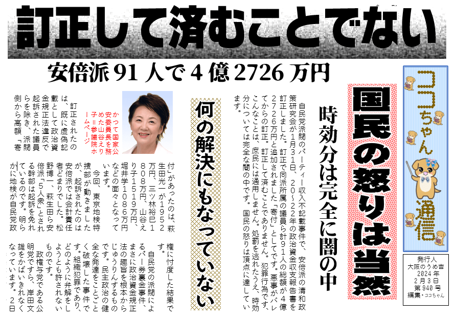 自民党派閥のパーティー収入不記載事件で、安倍派の清和政策研究会が1月31日、20~22年の政治資金収支報告書を訂正しました。訂正で同派所属の議員ら計91人の総額が4億2726万円と追加されました「寄付」としてです。悪事がバレてからの訂正。訂正して済むことでありません。犯罪行為です、こんなことは、庶民には通用しません。処罰を逃れたうえ、時効分については完全な闇の中です。国民の怒りは頂点に達しています。