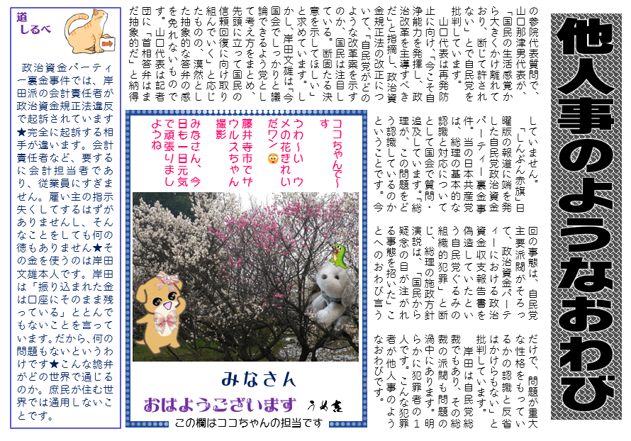 「しんぶん赤旗」日曜版の報道に端を発した自民党政治資金パーティー裏金事件。当の日本共産党は、総理の基本的な認識と対応についてとして国会で質問・追及しています。「総理が、この問題をどう認識しているのかということです。今回の事態は、自民党主要派閥がそろって、政治資金パーティーにおける政治資金収支報告書を偽造していたという自民党ぐるみの組織的犯罪」と断じ、総理の施政方針演説は、「国民から疑念の目が注がれる事態を招いた」ことへのおわび言うだけで、問題が重大な性格をもっているかの認識と反省はかけらもない」と批判しています。