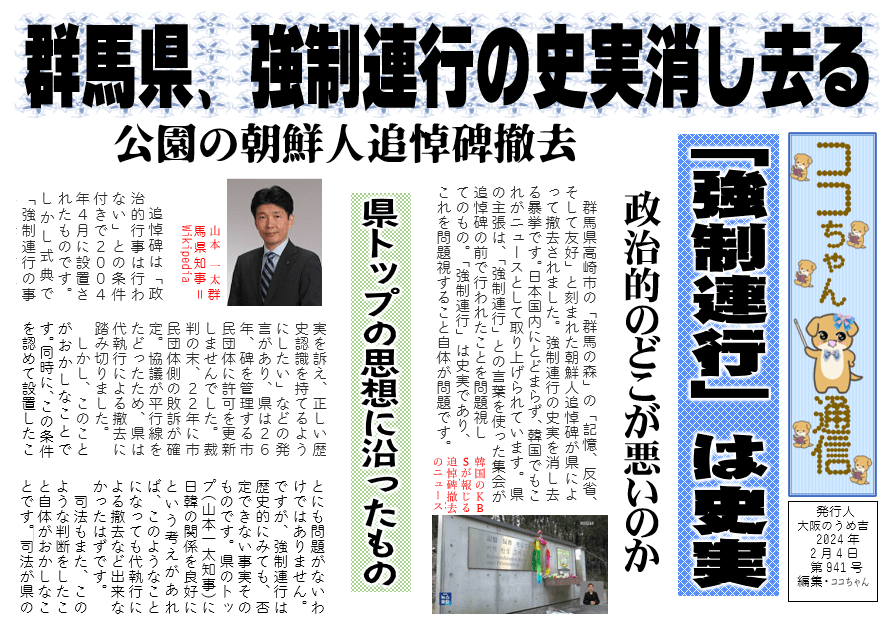群馬県高崎市の「群馬の森」の「記憶、反省、そして友好」と刻まれた朝鮮人追悼碑が県によって撤去されました。強制連行の史実を消し去る暴挙です。日本国内にとどまらず、韓国でもこれがニュースとして取り上げられています。県の主張は、「強制連行」との言葉を使った集会が追悼碑の前で行われたことを問題視し
