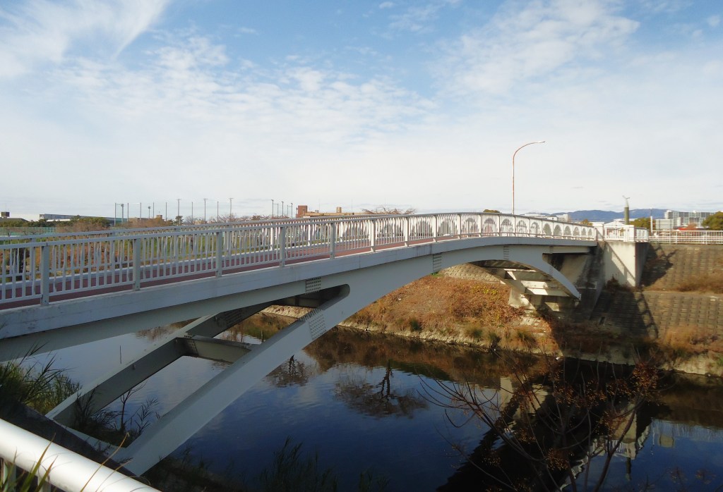 安威川に隣接する番田水路に架かる歩行者と自転車のみの専用橋です