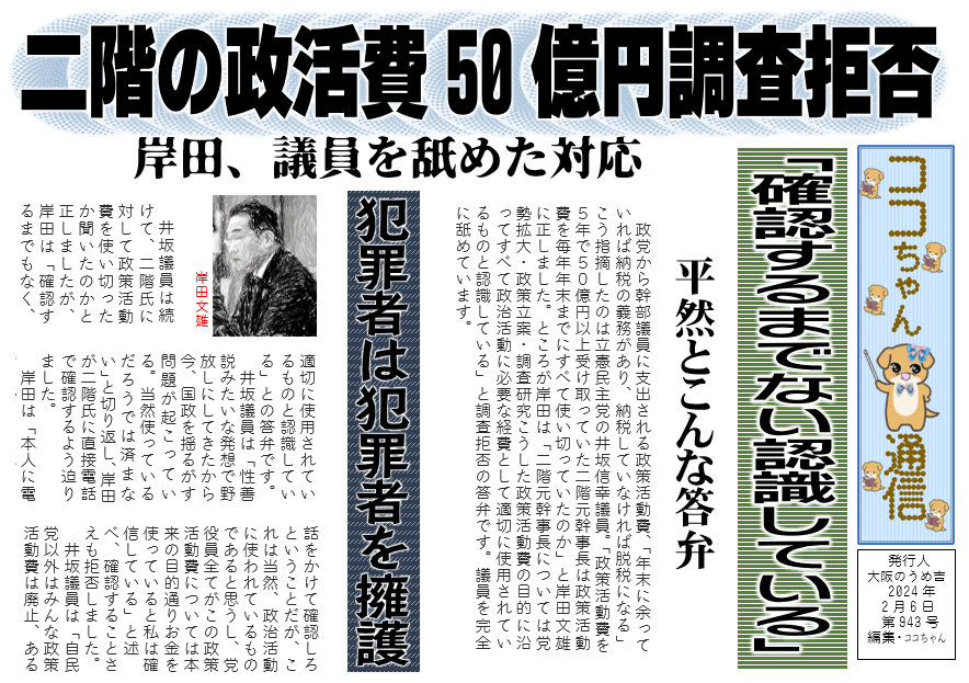 政党から幹部議員に支出される政策活動費、「年末に余っていれば納税の義務があり、納税していなければ脱税になる」こう指摘したのは立憲民主党の井坂信幸議員。「政策活動費を5年で50億円以上受け取っていた二階元幹事長は政策活動費を毎年年末までにすべて使い切っていたのか」と岸田文雄に正しました。ところが岸田は「二階元幹事長については党勢拡大・政策立案・調査研究こうした政策活動費の目的に沿ってすべて政治活動に必要な経費として適切に使用されているものと認識している」と調査拒否の答弁です。議員を完全に舐めています。