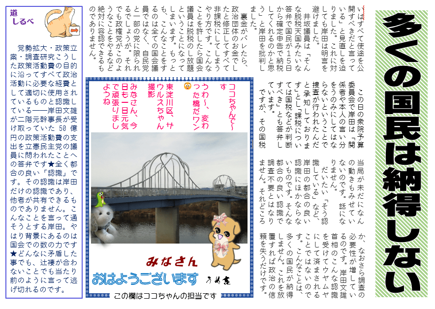 道しるべ 党勢拡大・政策立案・調査研究こうした政策活動費の目的に沿ってすべて政治活動に必要な経費として適切に使用されているものと認識している――岸田文雄が二階元幹事長が受け取っていた50億円の政策活動費の支出を立憲民主党の議員に問われたことへの答弁です★全く都合の良い「認識」です。その認識は岸田だけの認識であり、他者が共有できるものでありません。こんなことを言って通そうとする岸田。やはり背景にあるのは国会での数の力です★どんなに矛盾した事でも、辻褄が合わないことでも当たり前のように言って逃げ切れるのです。