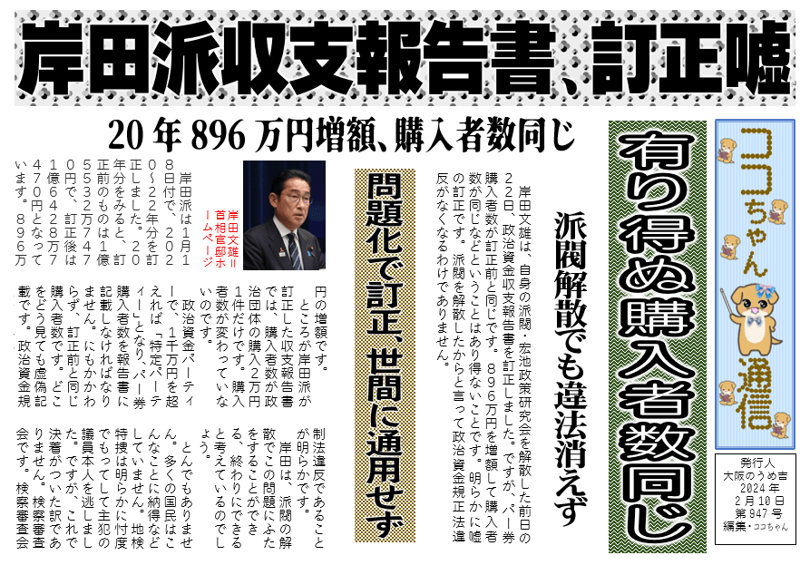 岸田文雄は、自身の派閥・宏池政策研究会を解散した前日の22日、政治資金収支報告書を訂正しました。ですが、パー券購入者数が訂正前と同じです。896万円を増額して購入者数が同じなどということはあり得ないことです。明らかに嘘の訂正です。派閥を解散したからと言って政治資金規正法違反がなくなるわけでありません。